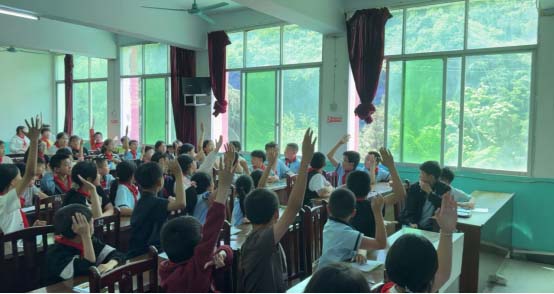 在专家提问、学生有奖竞答环节,专家刚提出“遇到山体滑坡应该往哪个方向跑?”,教室里立刻举起了密密麻麻的小手,五年级的李同学迅速准确地回答:“要往滑坡体两侧的高处跑。”赢得了全场热烈的掌声和一份精美的小奖品。在学生提问、专家解答环节,学生们纷纷抓住难得的机会,提出心中的疑惑:“如果被困在泥石流区域,该怎么保护自己?”、“家里的房子靠近山坡,平时要怎么检查有没有危险?”面对这些问题,专家们耐心细致地逐一解答,并结合实际案例进行拓展分析,让学生们了然于胸。
